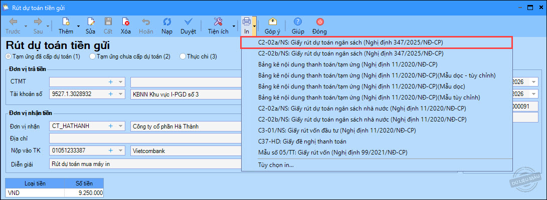 - Ví dụ 1: In mẫu C2-02a/NS: Giấy rút dự toán ngân sách.