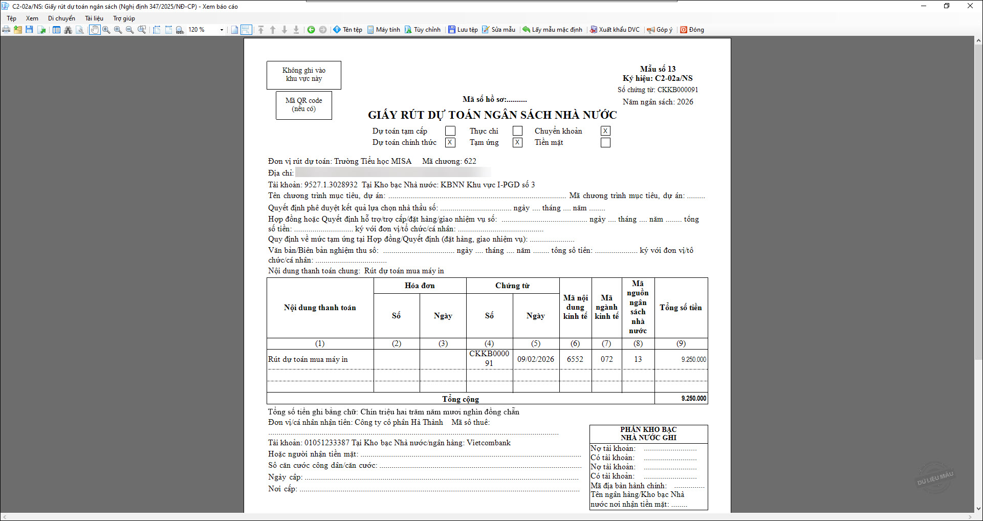 Trên chứng từ kế toán, khi anh/chị in báo cáo để nộp KBNN, phần mềm tự động cập nhật các biểu mẫu theo Nghị định 347/2025/NĐ-CP.