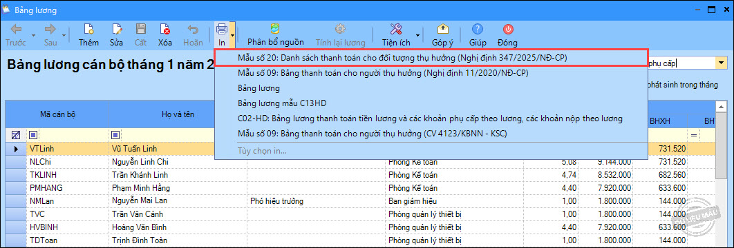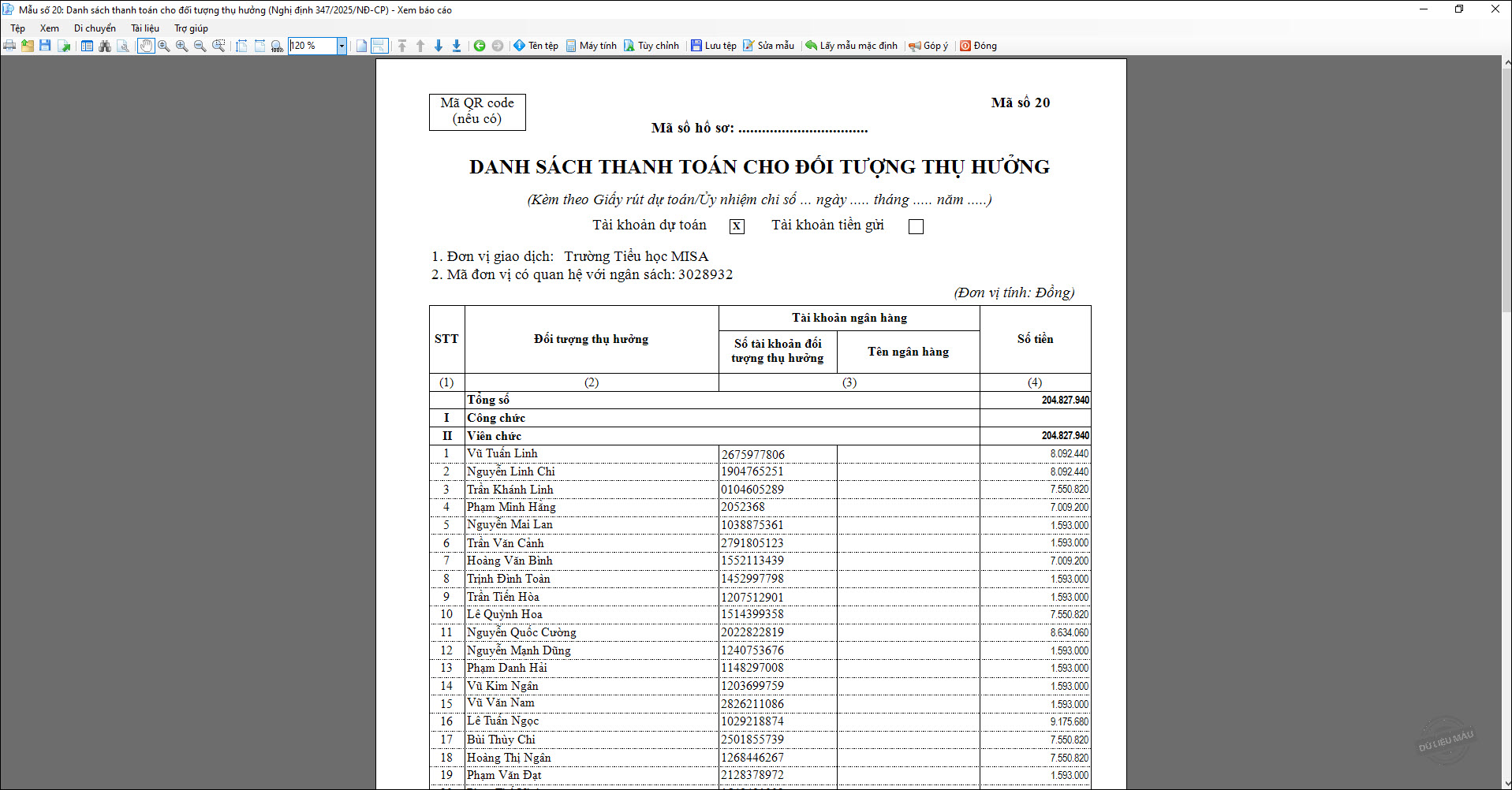 - Ví dụ 2: In mẫu 20: Danh sách thanh toán cho đối tượng thụ hưởng.