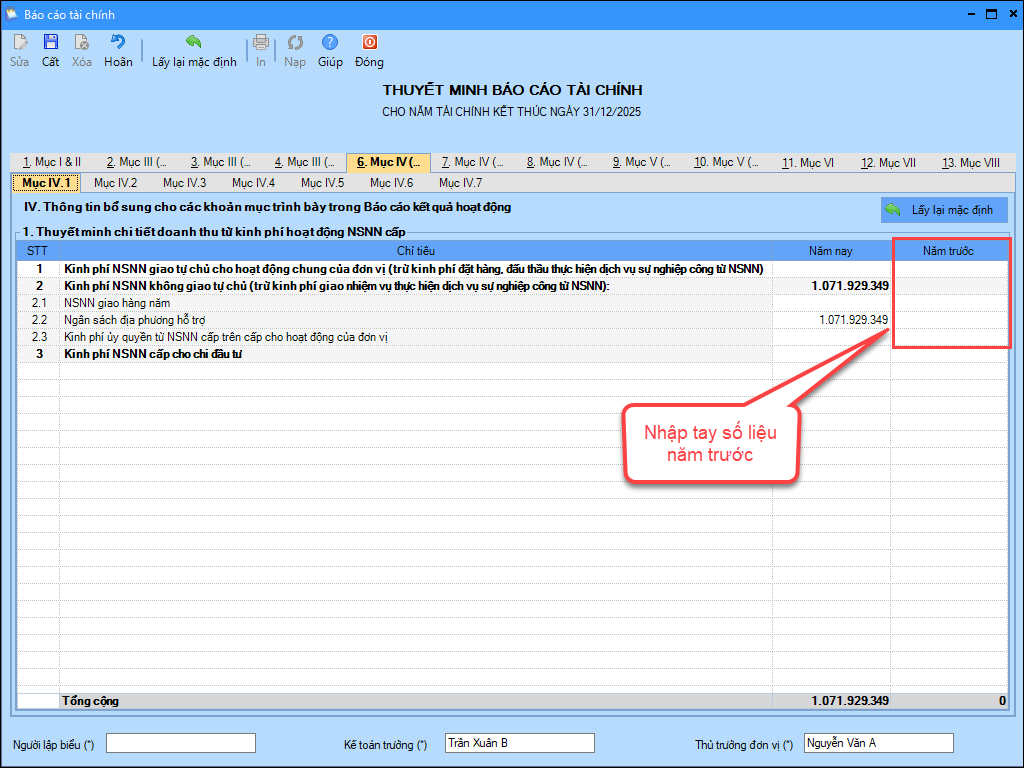 3. Điền số liệu năm trước vào các mục còn thiếu. Nhấn Cất