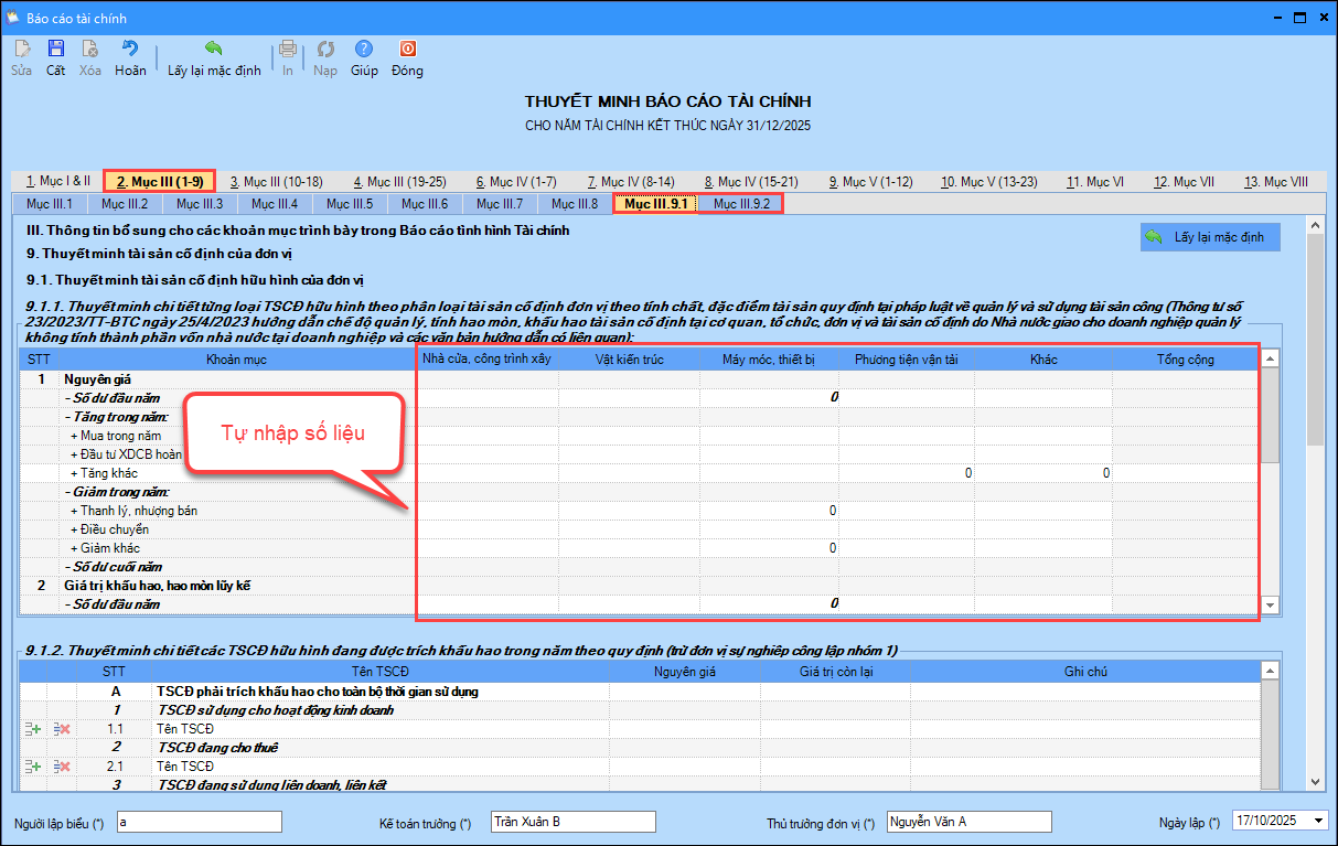 • Khai báo thông tin TSCĐ ở mục III.9.1III.9.2
