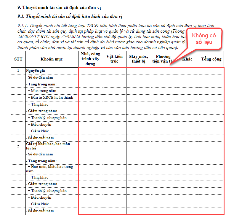 Khi lập báo cáo B04/BCTC, tôi thấy chỉ tiêu Thuyết minh tài sản cố định của đơn vị không có số liệu thì làm thế nào?