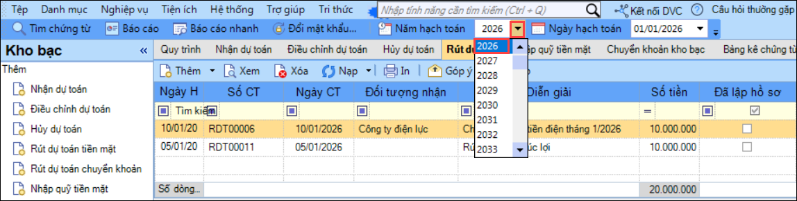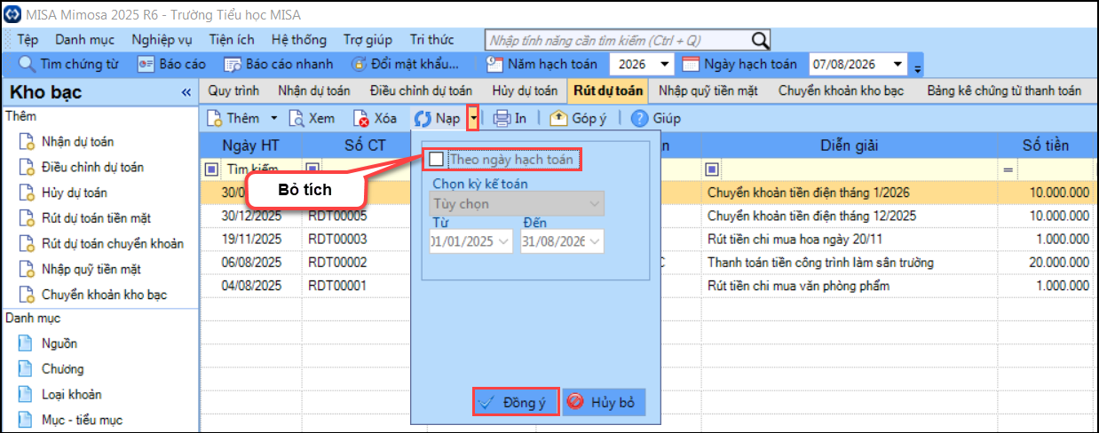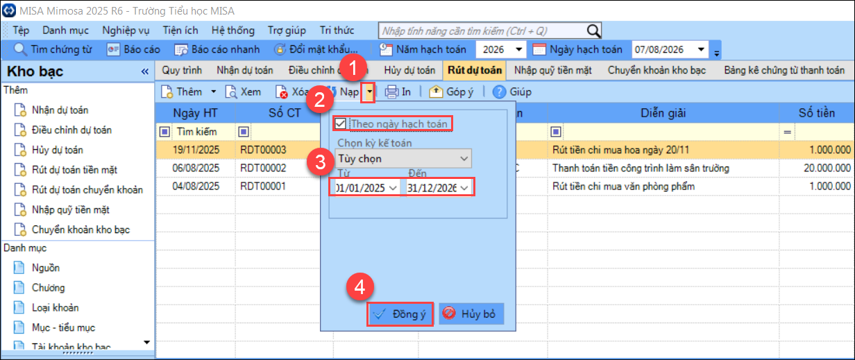 • Bước 2: Tại danh sách chứng từ Rút dự toán, bạn nhấn vào phím Mũi tên cạnh nút Nạp, rồi tích vào ô Theo ngày hạch toán và chọn Kỳ kế toán từ năm trước đến năm nay (ví dụ 01/01/2025 đến 31/12/2026) rồi nhấn Đồng ý.