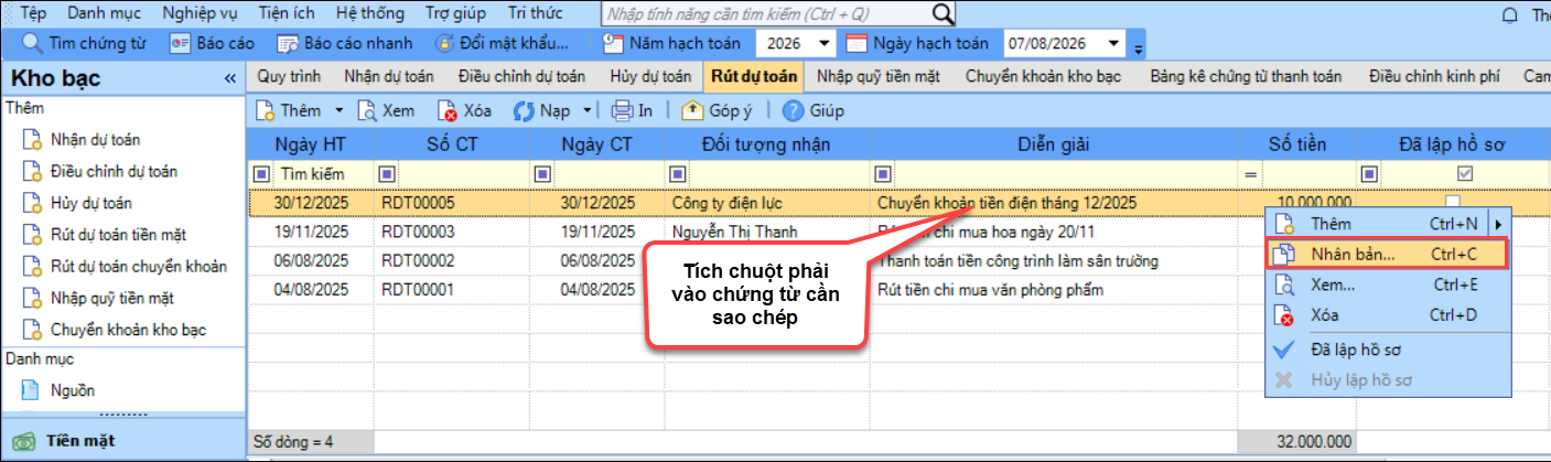 • Bước 3: Sau khi nhấn Đồng ý, trên danh sách chứng từ Rút dự toán hiển thị lên cả các chứng từ của năm trước, nếu muốn sao chép nội dung của chứng từ nào, bạn nhấn chuột phải vào dòng của chứng từ đó và chọn Nhân bản.