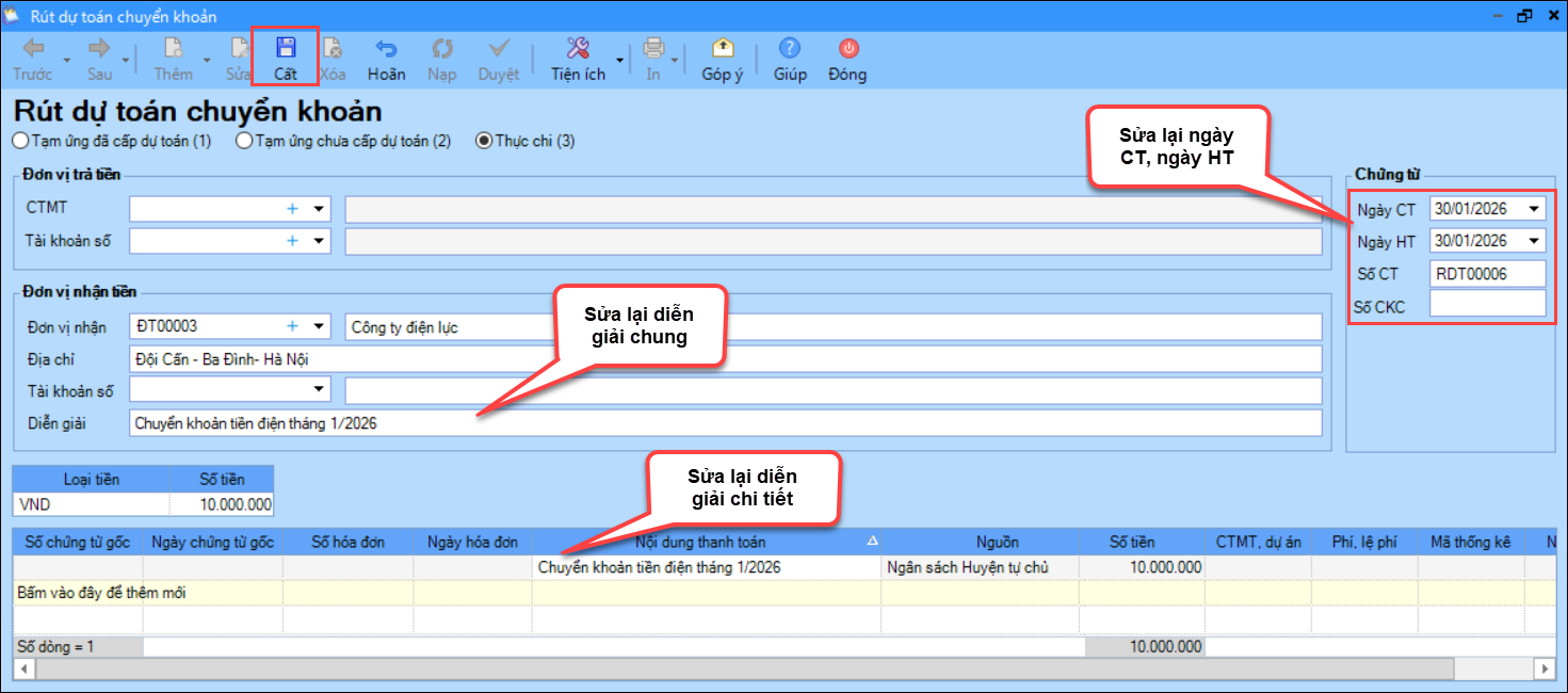 • Bước 4: Tại chứng từ vừa được sao chép lên, bạn sửa lại nội dung, ngày hạch toán và ngày chứng từ cho đúng rồi nhấn Cất.