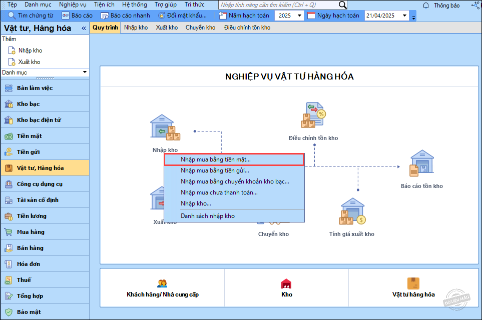 1. Vào phân hệ Vật tư, hàng hóa, chọn Nhập kho\Nhập mua bằng tiền mặt.