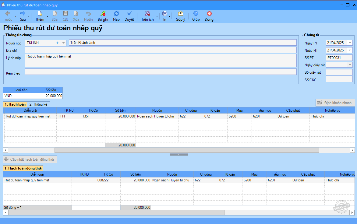 2. Khai báo thông tin chứng từ Phiếu thu rút dự toán về nhập quỹ: