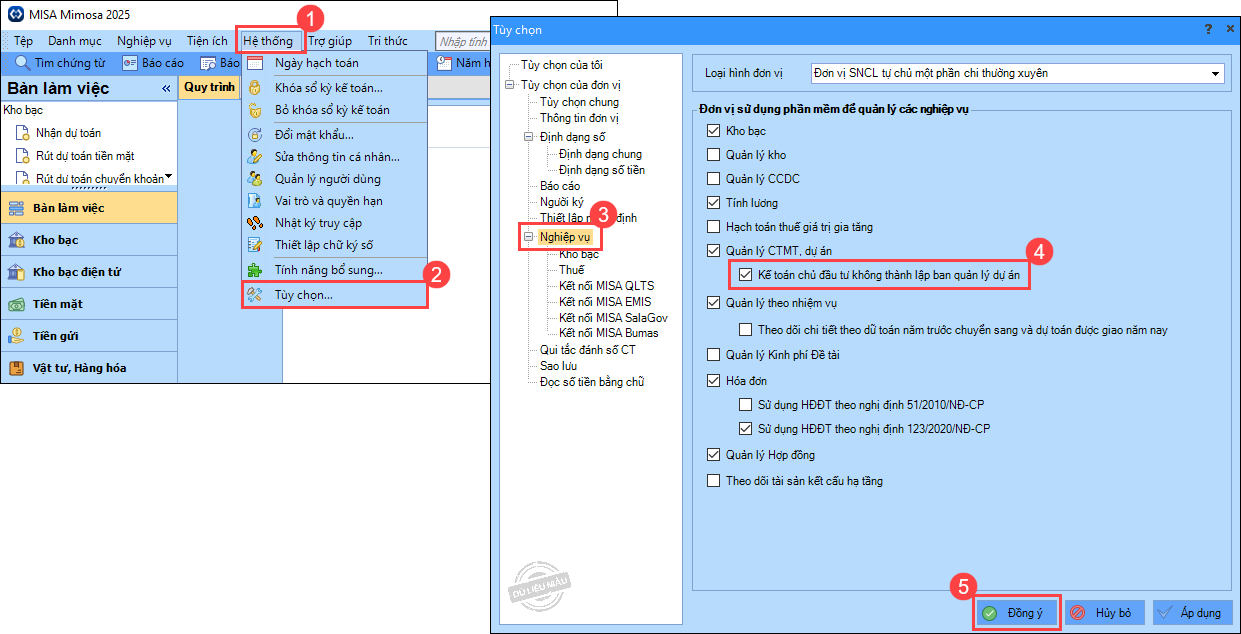 • Chọn Nghiệp vụ, tích chọn Kế toán chủ đầu tư không thành lập ban quản lý dự án