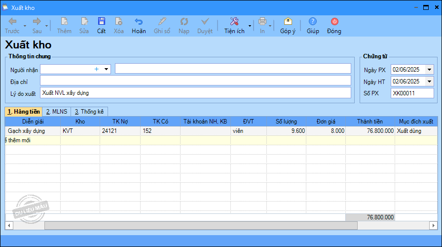 – Ngày 02/06/2025, xuất kho NVL cho XDCB: Gạch 960 viên, Thép 195 cây, Xi măng 700 bao.