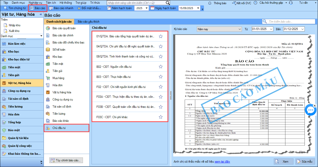 5. F03B-CĐT: Quyết toán vốn đầu tư theo dự án, công trình, hạng mục công trình hoàn thành bàn giao sử dụng.