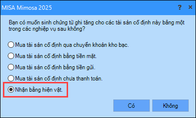 5. Nhấn Cất. Hệ thống hiển thị thông báo sinh chứng từ ghi tăng cho tài sản, tích chọn Nhận bằng hiện vật, nhấn .