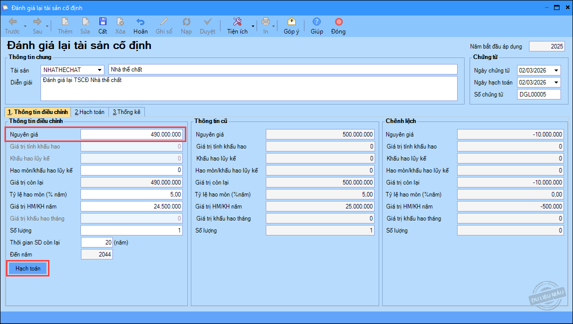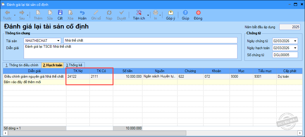 Ví dụ: Đánh giá giảm nguyên giá của tài sản, số tiền: 10.000.000 đồng. Đơn vị thực hiện như sau: