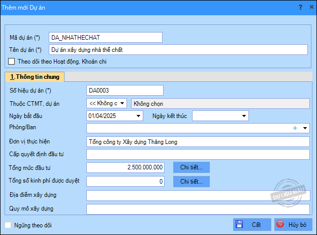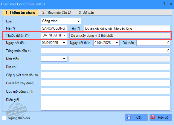 Lưu ý: Nếu dự án có chia ra nhiều công trình, hạng mục công trình thì tạo thêm các công trình thuộc dự án, hạng mục công trình thuộc công trình.