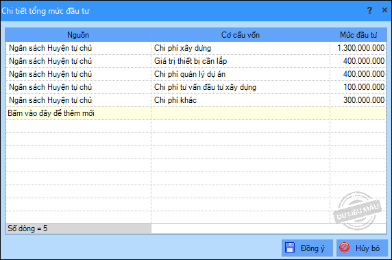 • Để khai báo chi tiết cơ cấu vốn, tại Tổng mức đầu tư, anh/chị chọn Chi tiết.