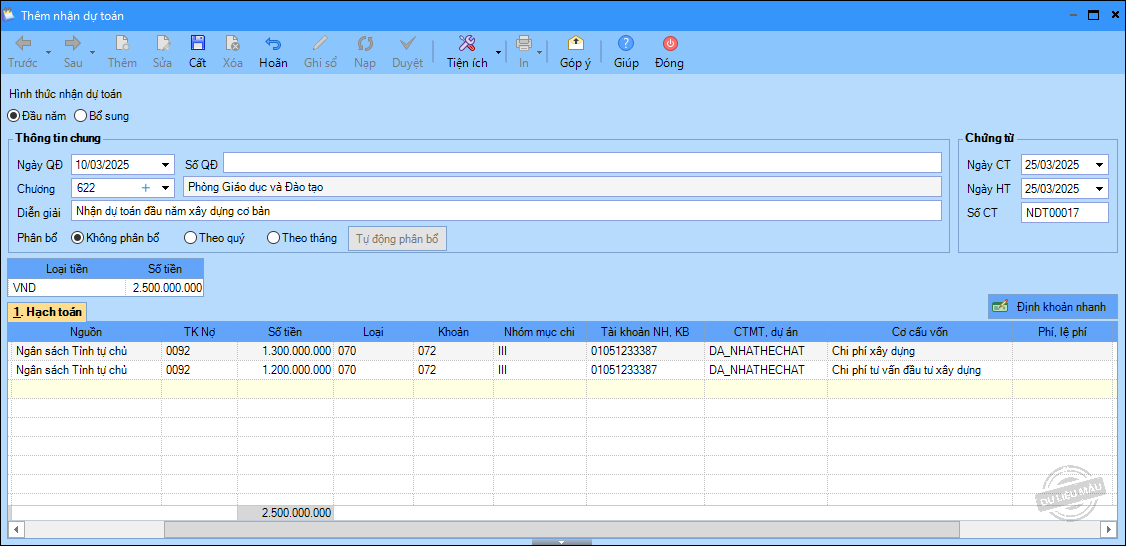 – Ngày 25/03/2025, đơn vị nhận dự toán, số tiền: 2.500.000 đồng.