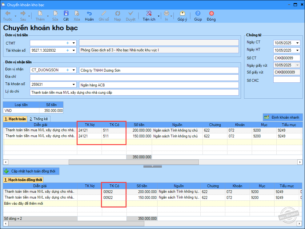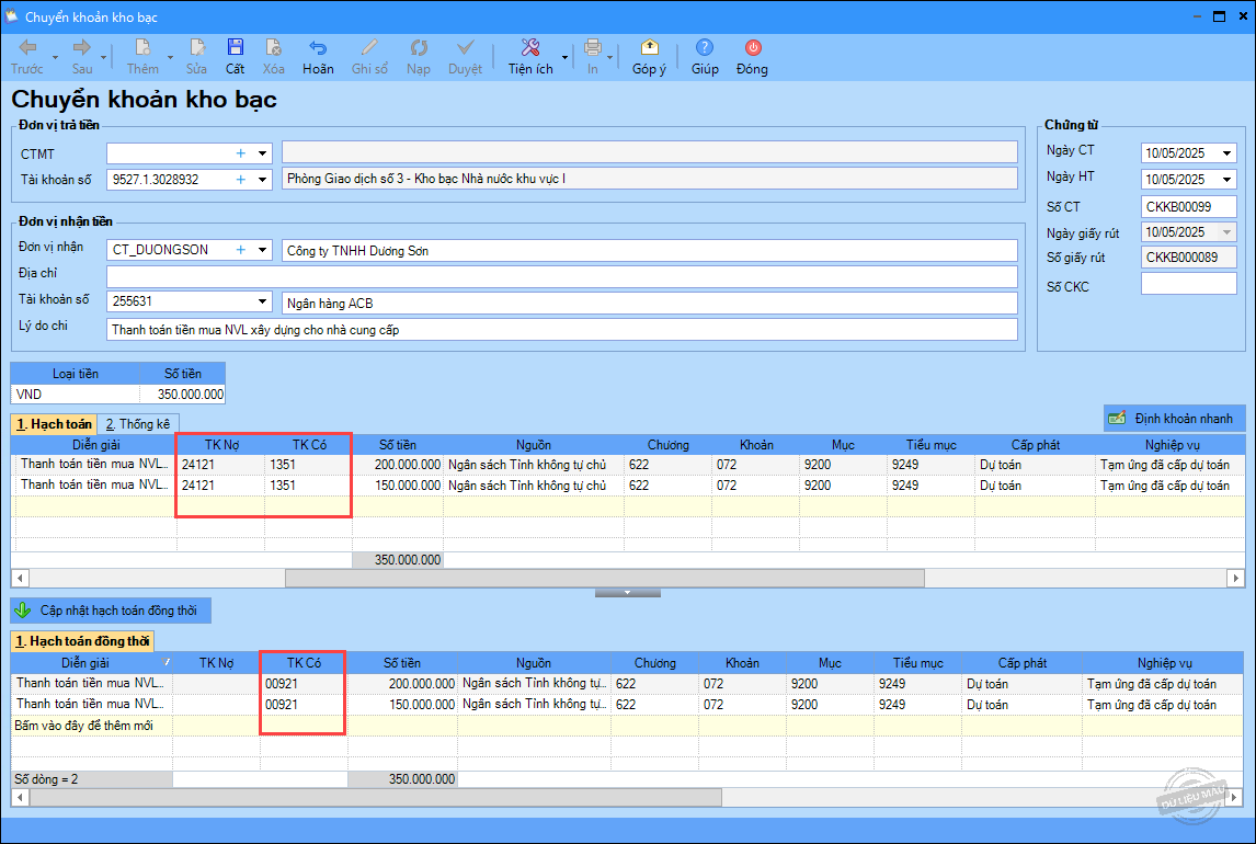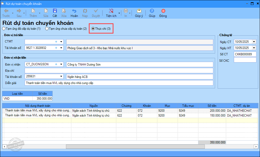 – Ngày 10/05/2025, đơn vị chuyển khoản kho bạc thanh toán tiền mua NVL xây dựng, số tiền 200.000.000đ và mua sắm máy móc: 150.000.000 đ.