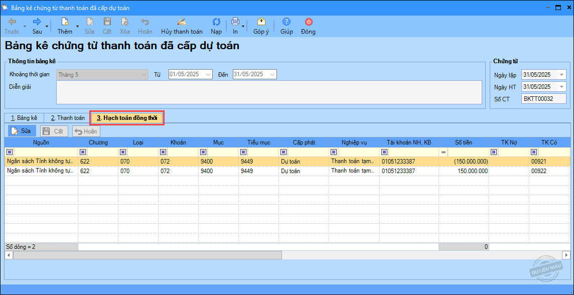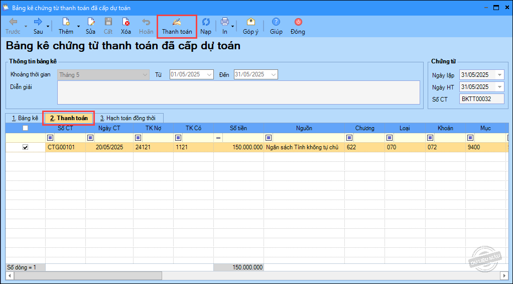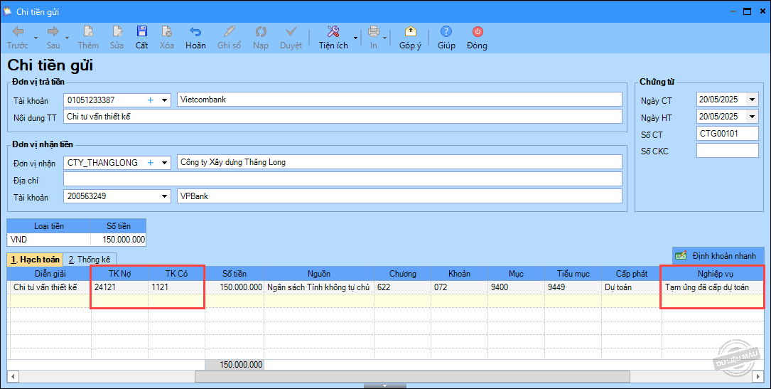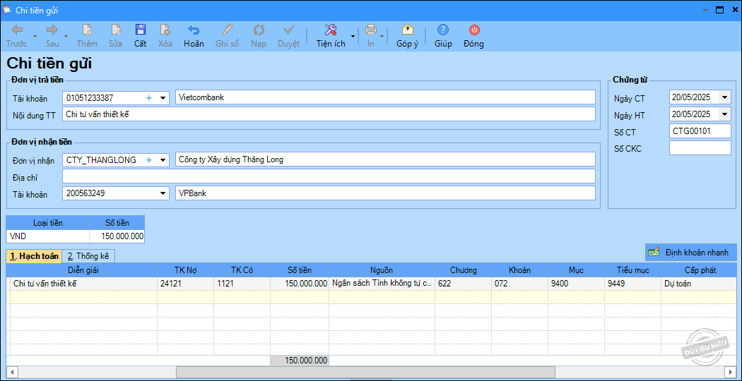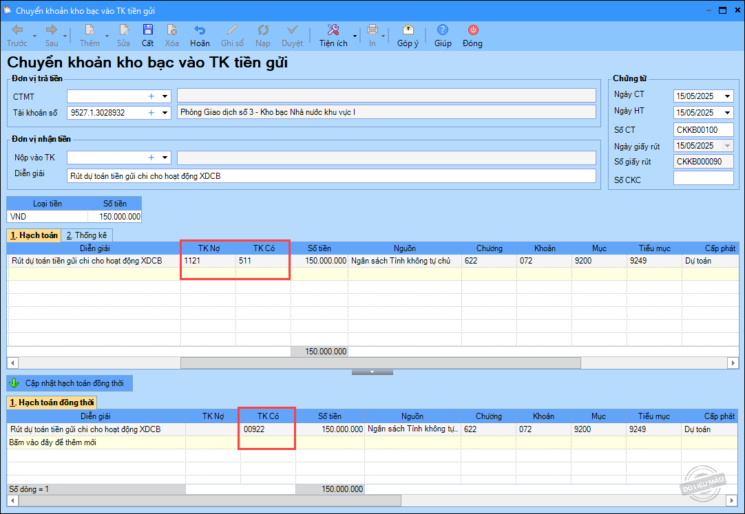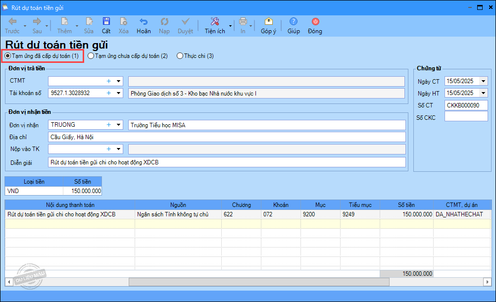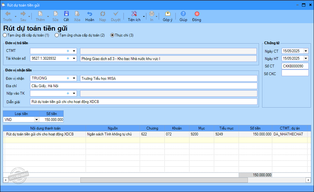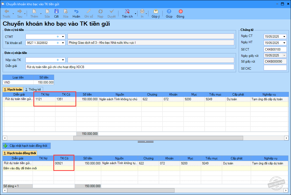 – Ngày 15/05/2025, rút dự toán về tài khoản tiền gửi để chi cho các hoạt động tại đơn vị: 150.000.000 đ