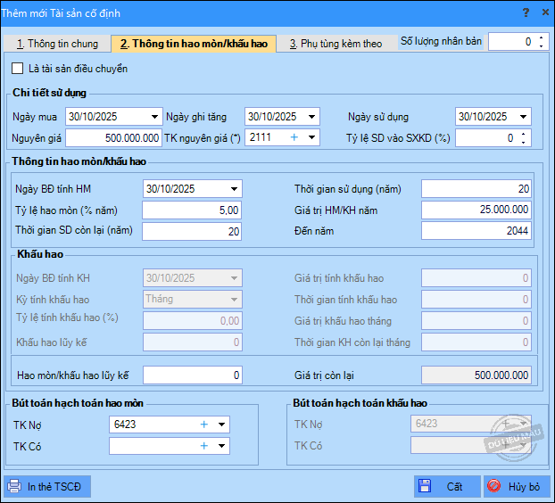 3. Khai báo Thông tin hao mòn/khấu hao của tài sản.