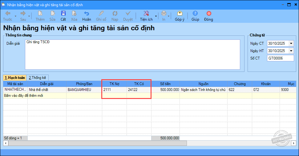 – Ngày 30/115/2025 sau khi quyết toán ghi giảm nguyên giá 50.000.000 đồng.