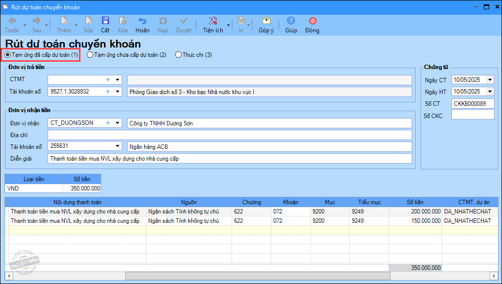 Ví dụ: Rút dự toán chuyển khoản thanh toán tiền mua nguyên vật liệu xây dựng cho nhà cung cấp.