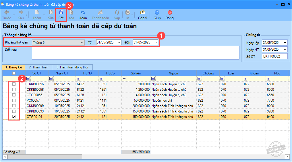 2. Tại màn hình Bảng kê chứng từ thanh toán đã cấp dự toán: