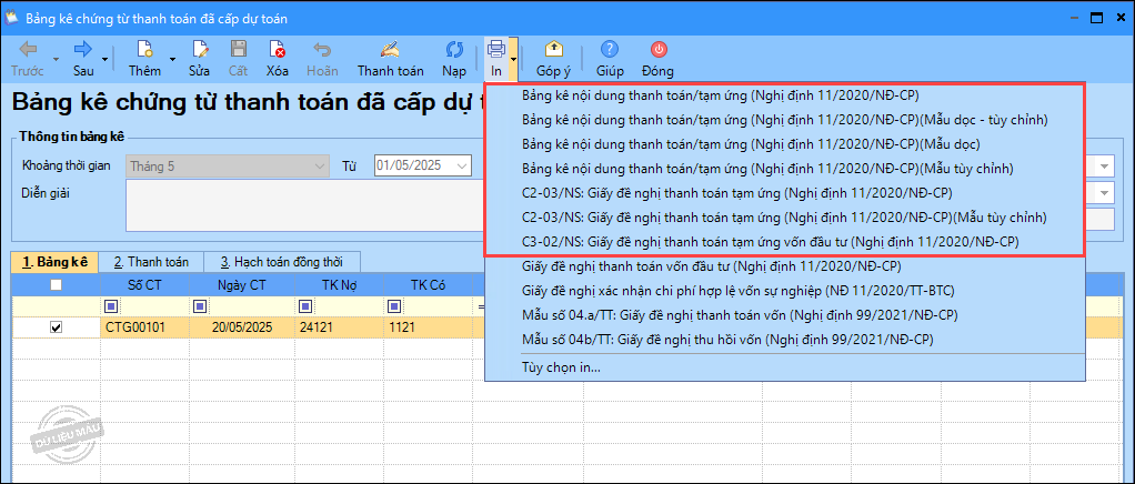 3. In Bảng kê chứng từ thanh toán đã cấp dự toán và Giấy đề nghị thanh toán tạm ứng (Nghị định 11/2020/NĐ-CP) bằng cách nhấn In, chọn mẫu cần in.