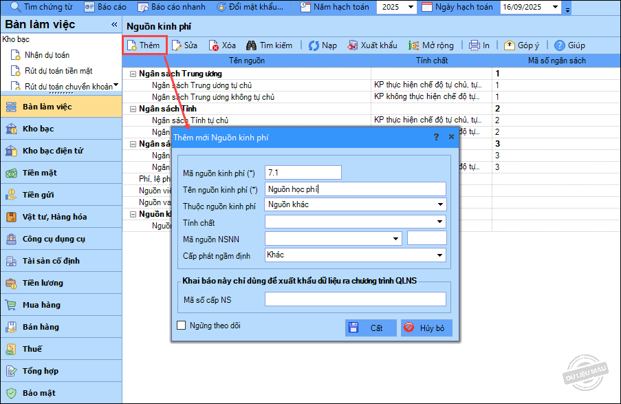 1. Đối với các khoản thu từ hoạt động sản xuất kinh doanh, dịch vụ, có thể mở thêm nguồn con tại Danh mục\Mục lục ngân sách\Nguồn kinh phí.