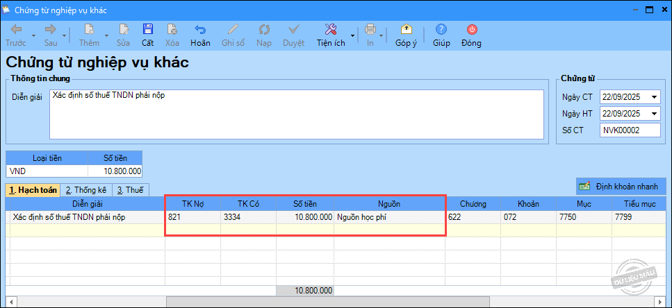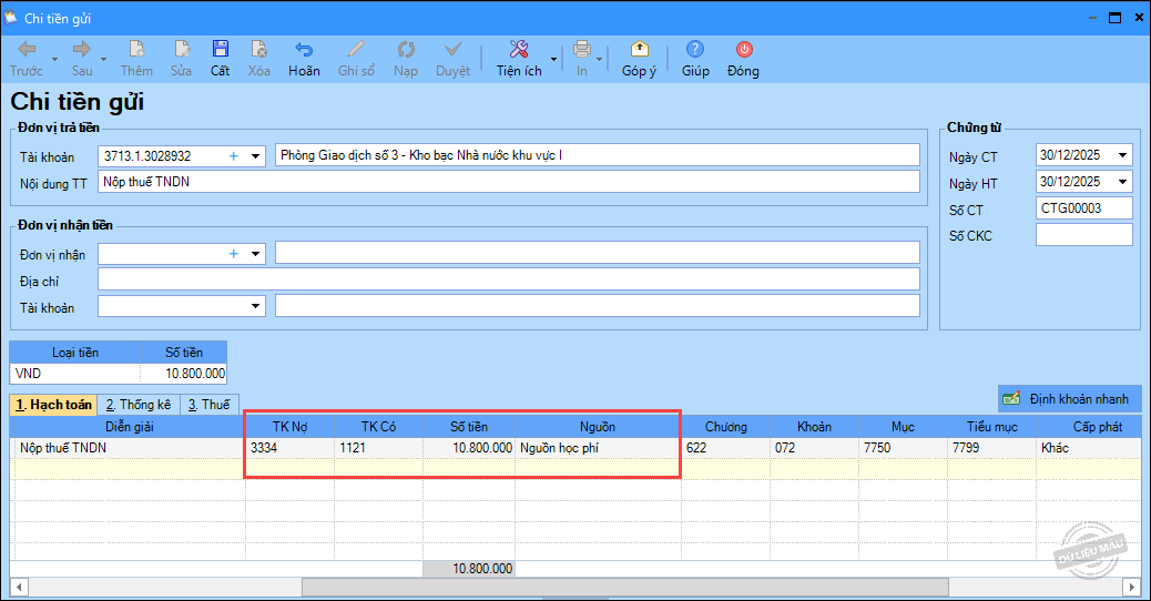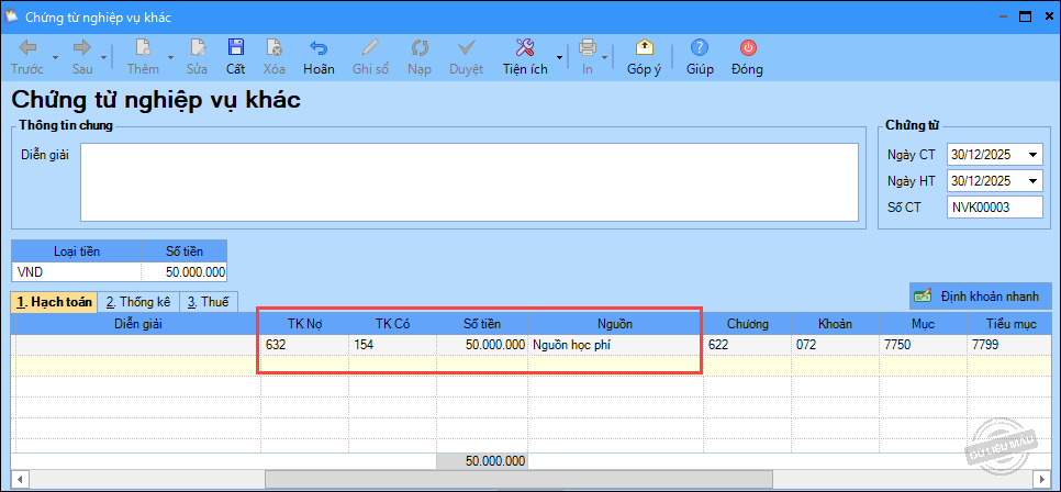 - Tại tab Hạch toán: Định khoản TK Nợ 154/642, TK Có 1121/1111, Số tiền, Nguồn là Nguồn học phí, Cấp phát là Khác và Nghiệp vụ là Không chọn.