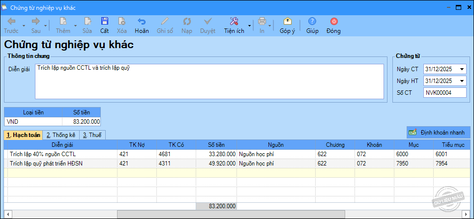 10. Ngày 31/12/2025, trích lập nguồn CCTL (40%) và quỹ phát triển hoạt động sự nghiệp (phần còn lại).