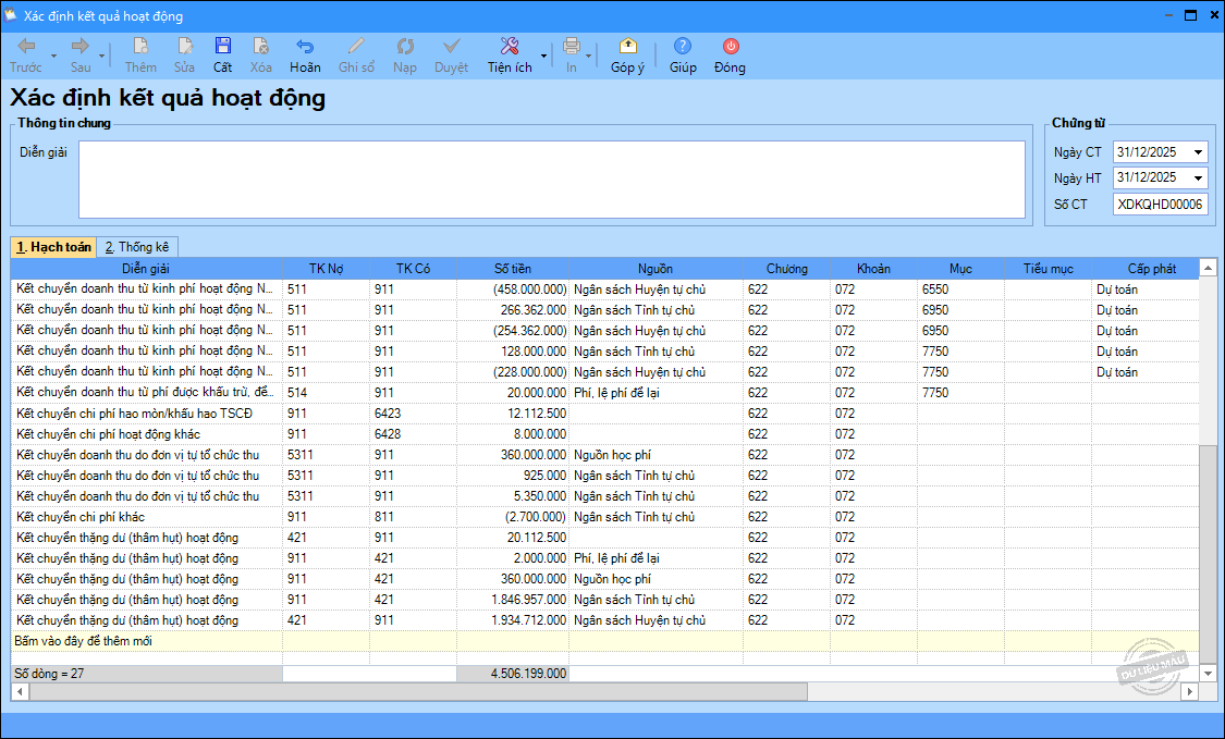 - Phần mềm lấy lên các chứng từ kết chuyển tại màn hình Xác định kết quả hoạt động.