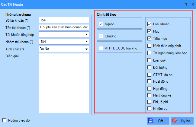 Vào Danh mục\Tài khoản\Hệ thống tài khoản. Nhấn đúp chuột tại tài khoản cần thiết lập. Tích chọn thông tin Chi tiết theo. Nhấn Cất.