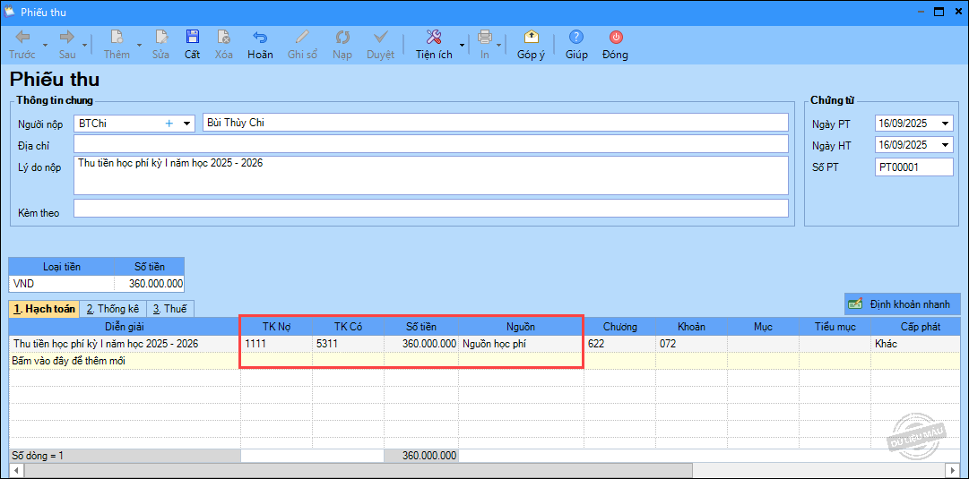 Ví dụ 1: Thu học phí học kỳ 1 bằng tiền mặt, số tiền: 360.000.000 đồng.