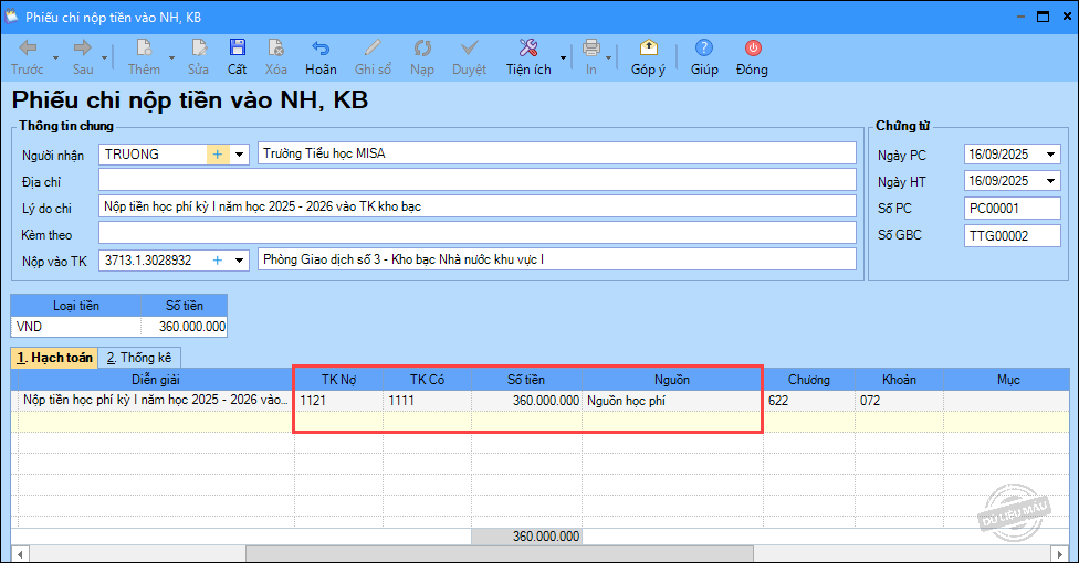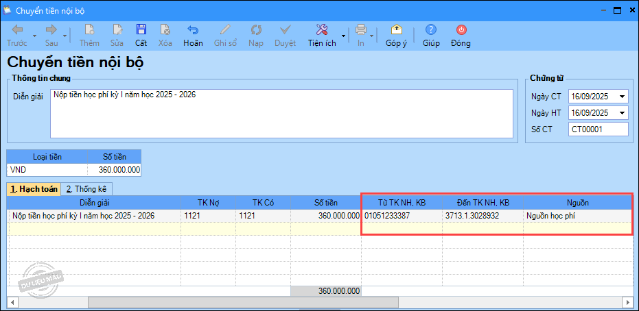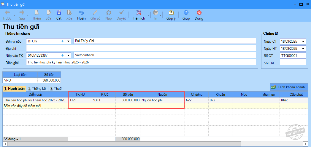 Ví dụ 2: Thu học phí học kỳ 1 năm học 2025 – 2026 bằng tiền gửi ngân hàng, số tiền: 360.000.000 đồng