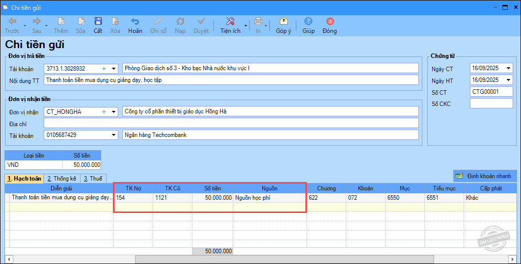 3. Ngày 16/09/2025, thanh toán tiền mua dụng cụ giảng dạy và học tập, số tiền: 50.000.000 đồng.
