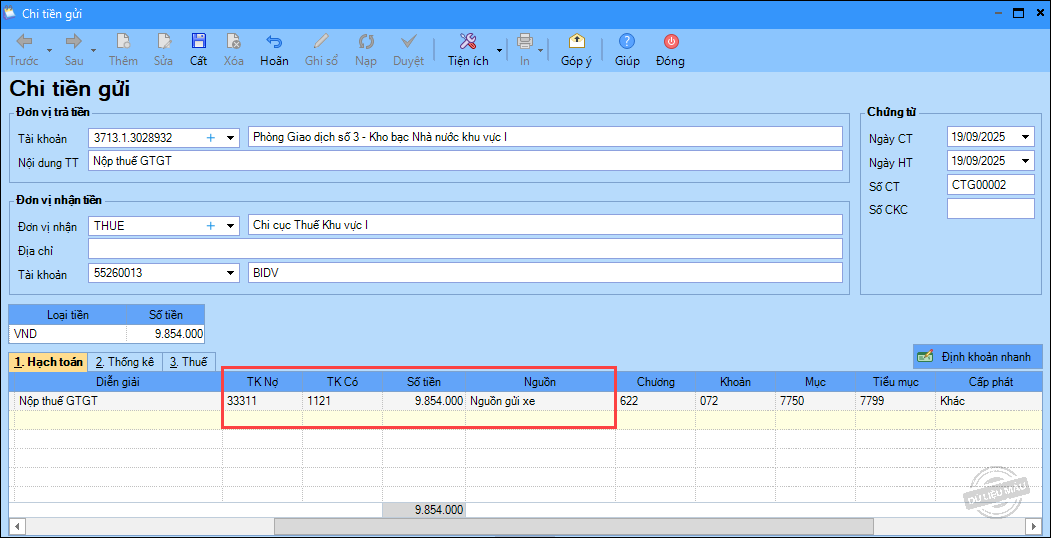 - Nộp bằng tiền gửi ngân hàng: Vào Tiền gửi\Chi tiền gửi.
