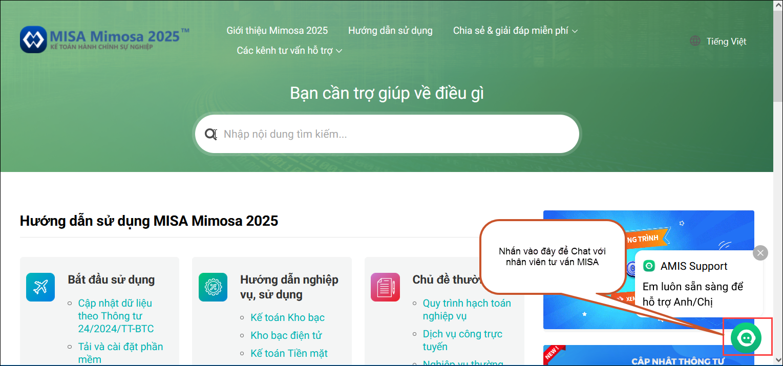 Tại màn hình https://helpmimosa.misa.vn/2025/, anh/chị chọn vào biểu tượng chat với nhân viên tư vấn.