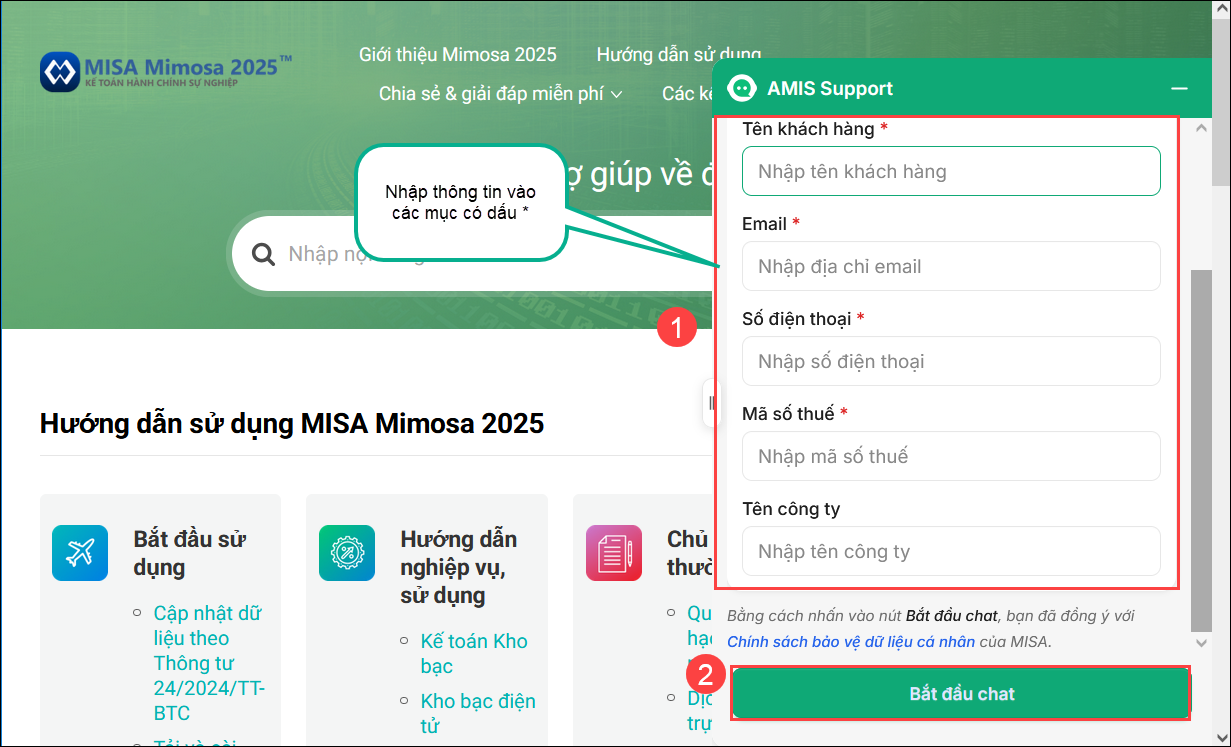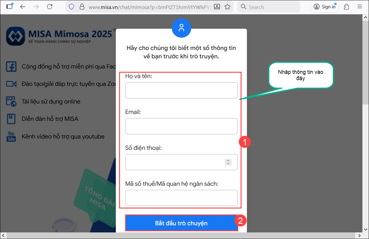 - Phần mềm tự động mở tới đường dẫn hỗ trợ trực tuyến như sau. Anh/chị chọn nhập thông tin rồi nhấn Bắt đầu chat để chat với nhân viên tư vấn.
