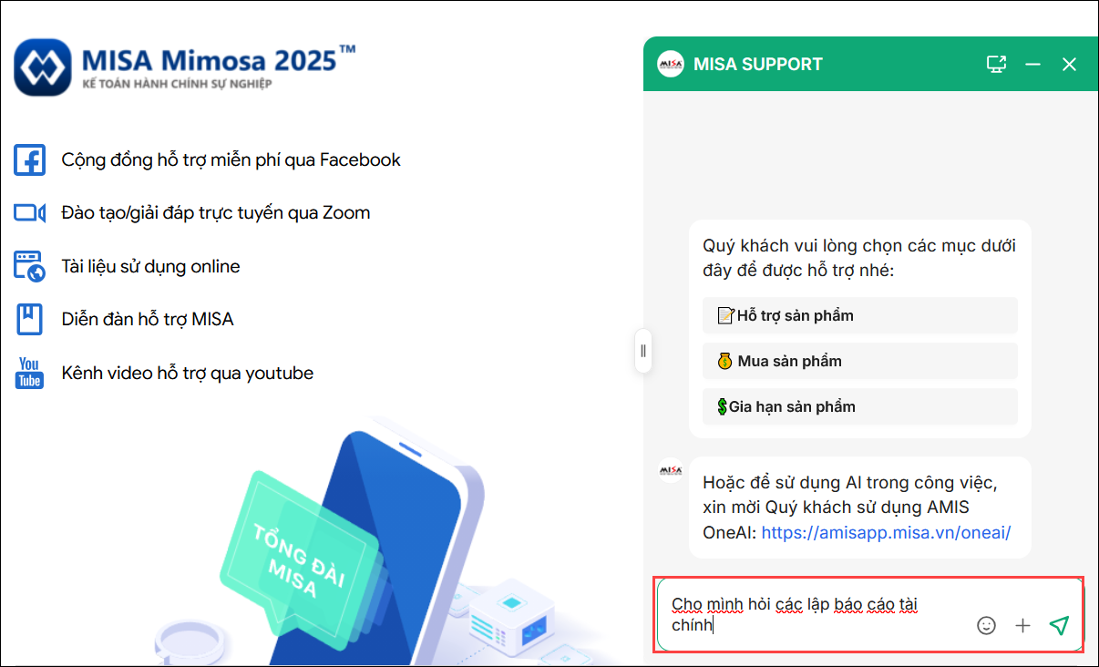 Cách 3: Anh/chị chọn menu Tư vấn\Chat với nhân viên tư vấn của MISA tại màn hình làm việc hoặc màn hình trước khi đăng nhập vào phần mềm.