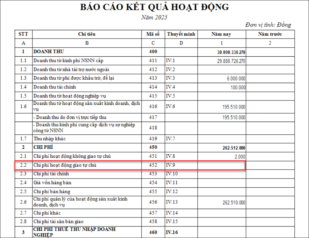 Tôi đã nhập phát sinh nguồn tự chủ nhưng khi xem báo cáo Kết quả hoạt động (B02/BCTC) không thấy lên số liệu chỉ tiêu Chi phí hoạt động giao tự chủ (452) thì làm thế nào?