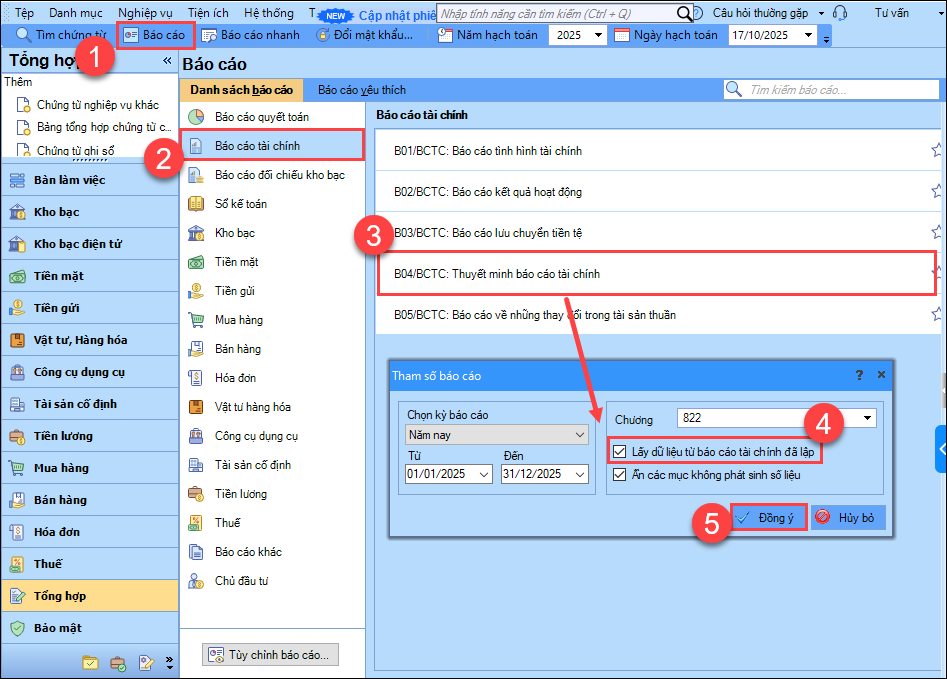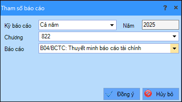 2. Trên bảng Tham số báo cáo, chọn Thuyết minh báo cáo tài chính, nhấn Đồng ý.
