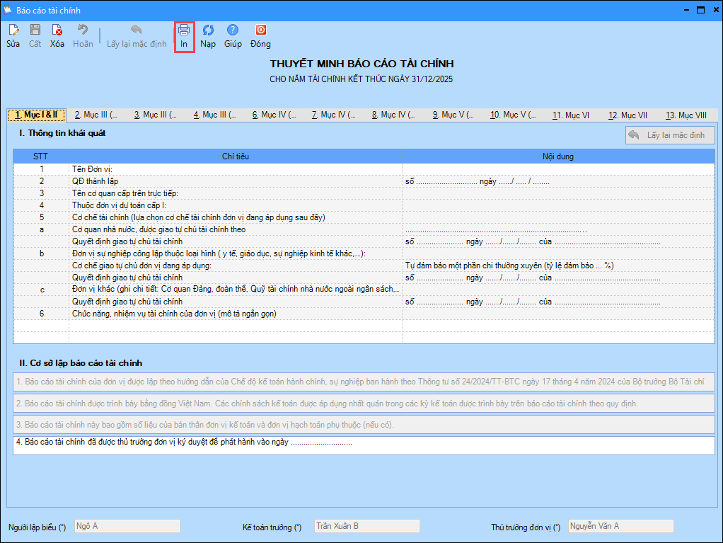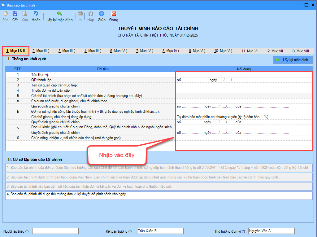 3. Trên màn hình Thuyết minh báo cáo tài chính, tại tab Mục I & II, bạn gõ trực tiếp các thông tin cần thể hiện trên báo cáo rồi nhấn Cất