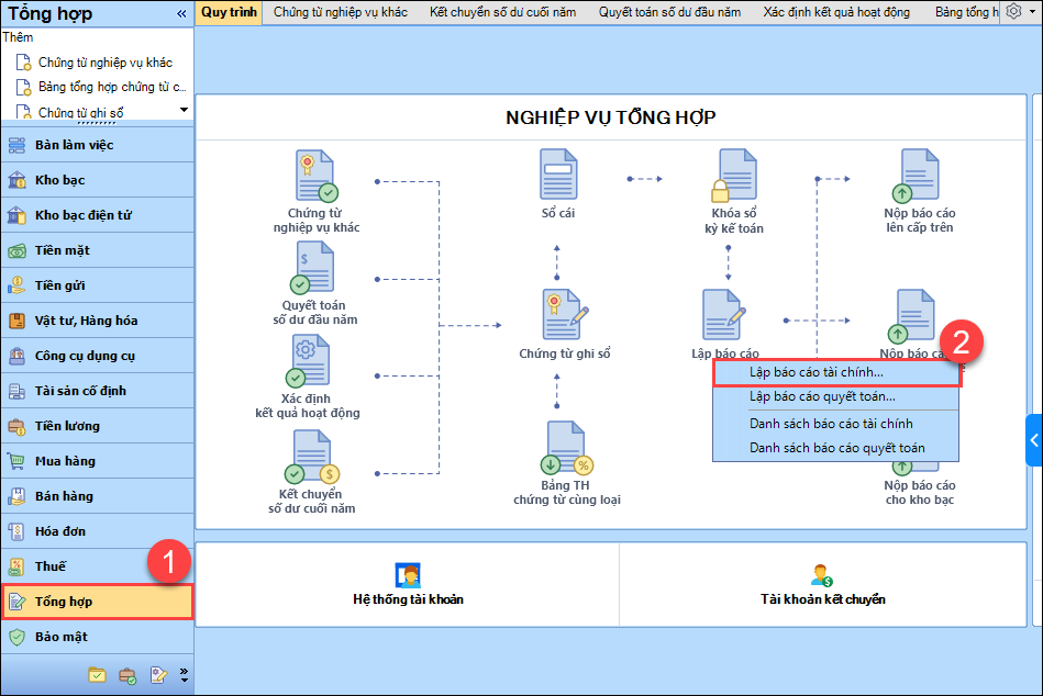1. Vào phân hệ Tổng hợp\Lập báo cáo\Lập Báo cáo tài chính