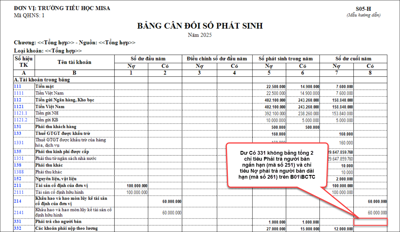 Khi xem B01/BCTC thấy số liệu tổng 2 chỉ tiêu Phải trả người bán ngắn hạn (mã số 251) và chỉ tiêu Phải trả người bán dài hạn (mã số 261) khác với số dư Có TK 331 trên Sổ S05-H: Bảng cân đối số phát sinh
