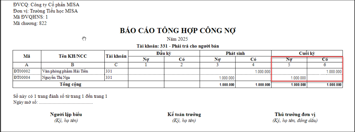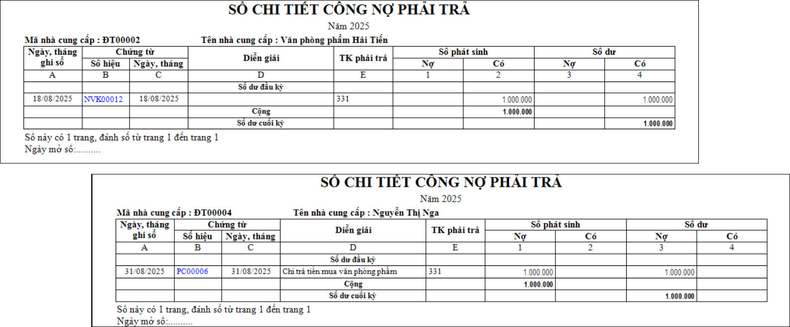 - Báo cáo sẽ thể hiện đối tượng bên Nợ và đối tượng bên Có đã chọn trên chứng từ hạch toán.