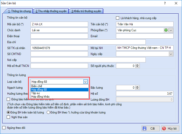 1. Chương trình cập nhật lại danh mục Loại cán bộ là Hợp đồng 68 và Hợp đồng khác (Danh mục\Cán bộ).