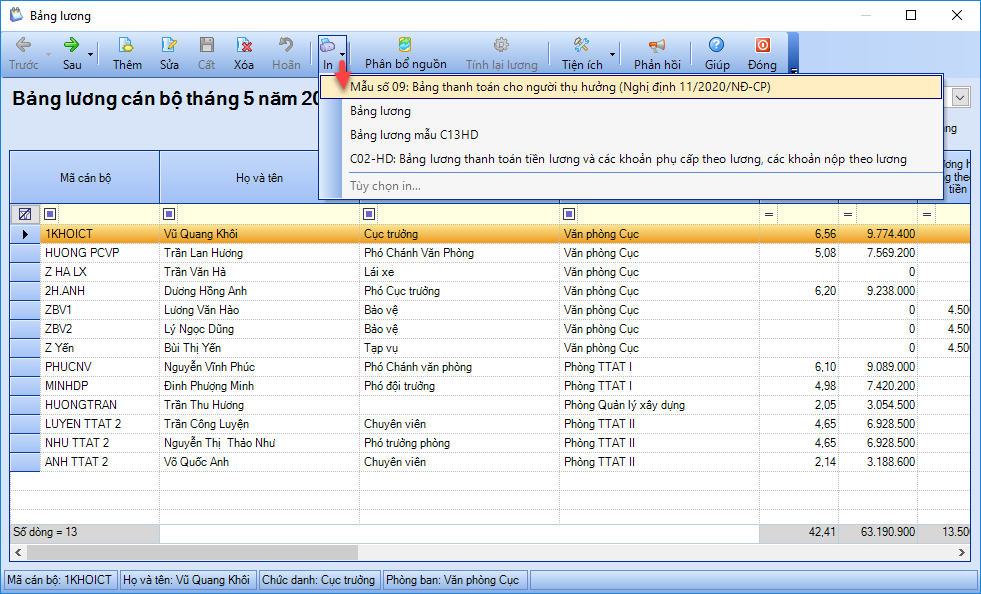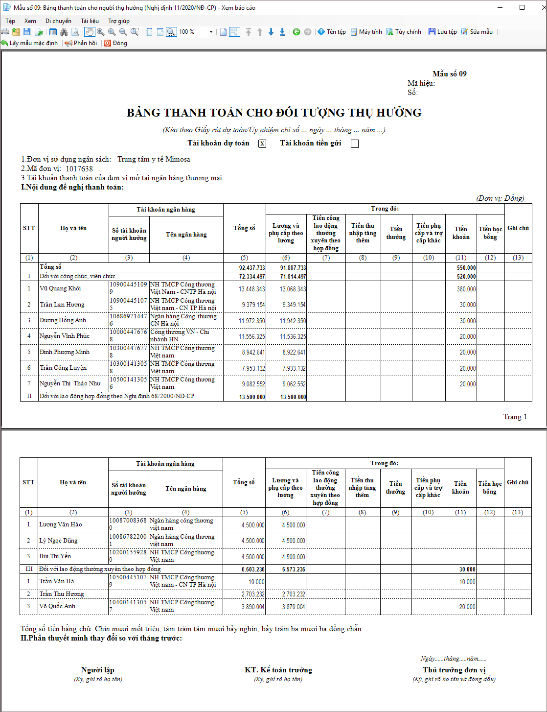 – Nhấn In\Mẫu số 09: Bảng thanh toán cho người thụ hưởng (Nghị định 11/2022/NĐ-CP).