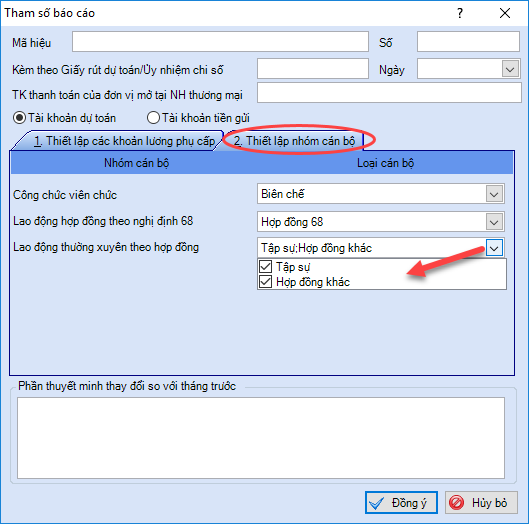 – Chọn tab Thiết lập nhóm cán bộ: chương trình mặc định sẵn loại cán bộ theo nhóm cán bộ. Có thể sửa lại bằng cách bỏ tích chọn (nếu muốn).