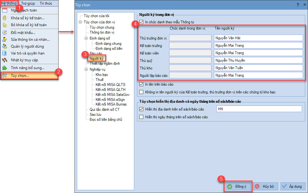 Tôi muốn thay đổi tên người ký trên chứng từ hoặc báo cáo thì làm thế nào? Để thay đổi tên người ký trên báo cáo, bạn thực hiện theo hướng dẫn sau Vào Hệ thống\Tùy chọn. Chọn Người ký Điền tên người ký rồi ấn Đồng ý ⇒ Mở lại báo cáo hoặc chứng từ rồi kiểm tra. Lượt xem: 4.525 Cập nhật 10/08/2022 Tagged: Đổi tên kế toánNgười Kýngười lậpTên thủ trưởngThay tên thủ quỹ Bài viết liên quan Làm thế nào để nhân bản chứng từ (Rút dự toán, phiếu thu, phiếu chi,…) Làm thế nào khi xóa file sao lưu báo “Access denied” hoặc tạo mới dữ liệu báo “Access to the path” Làm thế nào để nộp báo cáo đối chiếu kho bạc mẫu số 20a, mẫu số 20c từ phần mềm lên hệ thống DVC? Làm thế nào để chuyển ngôn ngữ Tiếng Anh sang Tiếng Việt trên Google Chrome? Khi xuất khẩu BCTC nộp cho KBNN trên phần mềm báo Các chỉ tiêu không phù hợp thì làm thế nào? Làm thế nào chuyển số liệu TK tiền gửi khác 3713 (không có mã dự phòng) sang TK 3713 (có mã dự phòng)? Giải đáp miễn phí qua facebookNếu bạn vẫn còn thắc mắc hãy đăng câu hỏi vào cộng đồng MISA qua facebook để được giải đáp miễn phí và nhanh chóngĐĂNG BÀI NGAY